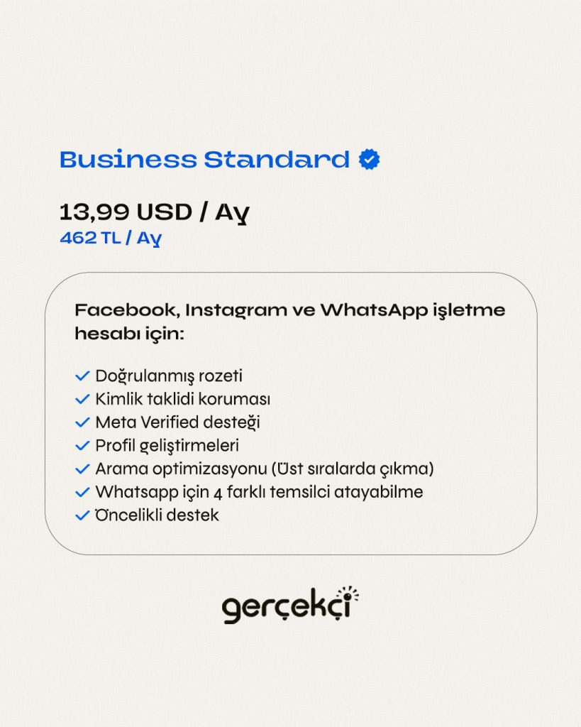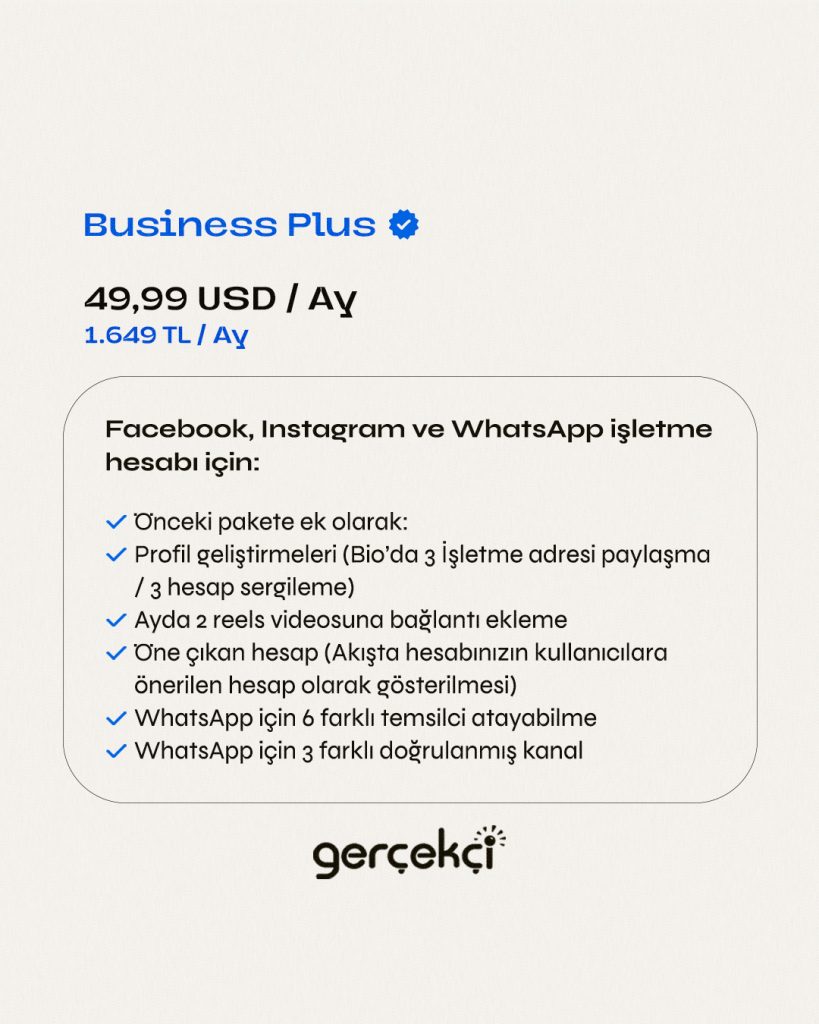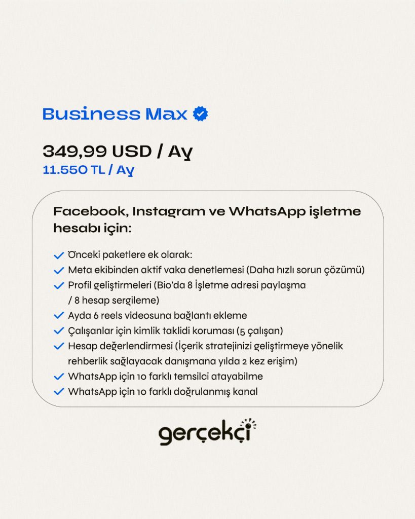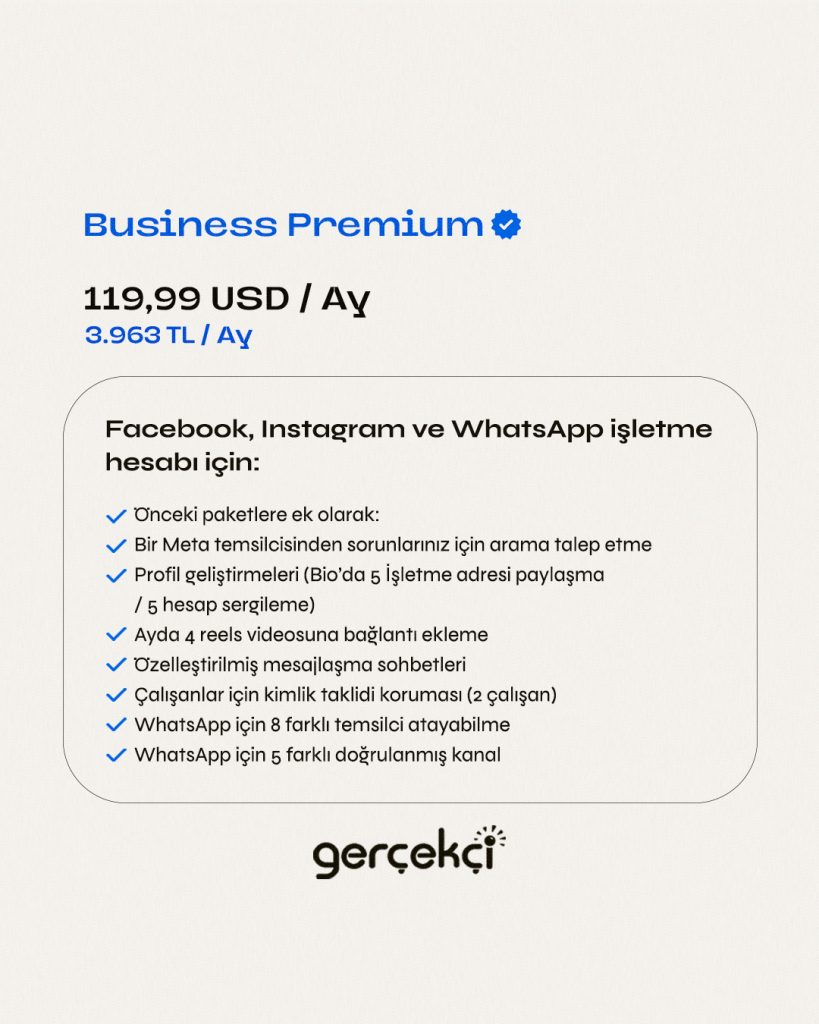 Meta’nın sunduğu mavi tik paketleri, sunulan avantajlara göre biraz yüksek fiyatlandırılmış gibi görünse de, bu fiyatlar özellikle sosyal medya ve WhatsApp üzerinden müşterileriyle sık iletişim kuran işletmeler için oldukça faydalıdır. Ayrıca, yıllık abonelik seçenekleri ile indirimli satın alma fırsatları da mevcut. Özellikle işini sosyal medyada yöneten ve sürekli etkileşim halinde olan işletmeler için bu paket, yatırım geri dönüşü sağlayabilir.